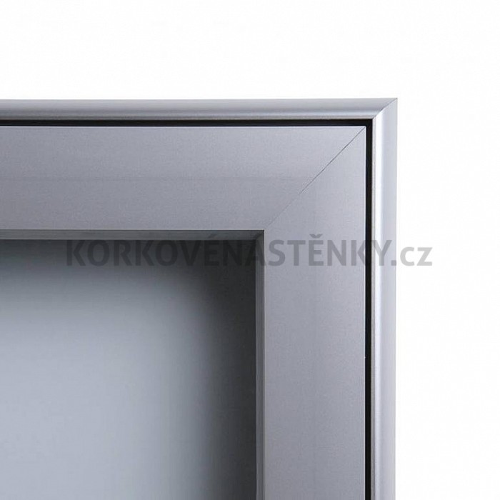 Venkovní robustní extra hluboká vitrína se stříbrně eloxovaným rámem. Skleněná výplň čelních dveří je z bezpečnostního skla (4 mm). Čelní dveře jsou osazeny gumovým těsněním, což zajišťuje její voděodolnost. Venkovní vitrína má silné hliníkové profily a ocelovou lakovanou zadní stěnu, která je popisovatelná a magnetická. Snadnou manipulaci zajišťují horní panty dveří s plynovými otvíracími písty.